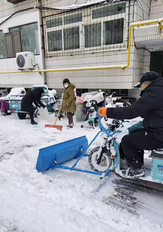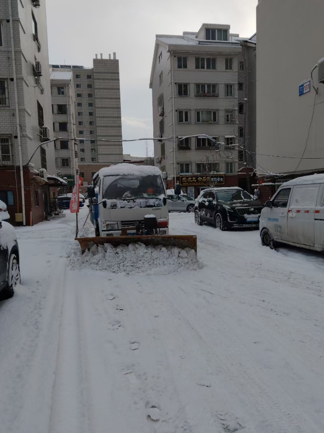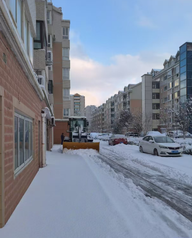 雪情就是命令,畅通就是责任。在星海物业各服务小区,清雪行动从大雪飘落的那一刻便同步开启。物业工作人员们放弃休息,全员集结,顶风冒雪奔赴各自负责的区域,凛冽的寒风刮红了脸颊,积雪落满了肩头,他们却无暇顾及,手中的铁锹、扫帚不停挥动,铲雪、扫雪、推雪,动作娴熟又默契。为了提升清雪效率,物业调配多辆铲雪车投入作业,大型机械在小区主干道来回穿梭,高效清理厚积雪,人工则对单元门口、人行道、台阶坡道等机械作业难以覆盖的区域进行精细化清扫,形成“机械为主、人工为辅、人机结合”的清雪模式,确保清雪工作无死角、无盲区。